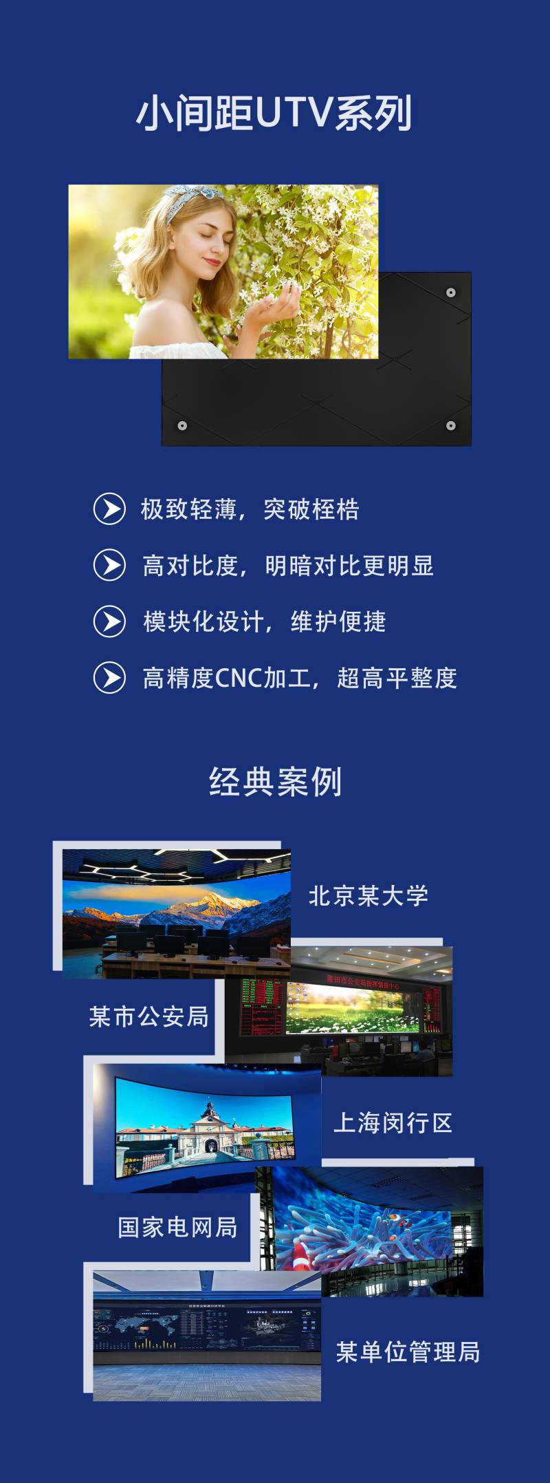 邁銳光電旗下當(dāng)家小間距產(chǎn)品——UTV系列,運(yùn)用“超薄”設(shè)計(jì)理念,單個(gè)箱體僅重4.5㎏,厚度僅25mm,采用全前安裝及維護(hù),高效便捷,并運(yùn)用獨(dú)特的隱藏式無(wú)線(xiàn)設(shè)計(jì),具有高平整度、低功耗、高亮度、寬色域等特點(diǎn),先后獲得3C、CE、CB、ETL、FCC、RoHS等認(rèn)證。