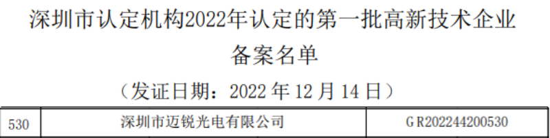 近日,全國高新技術(shù)企業(yè)認(rèn)定管理工作領(lǐng)導(dǎo)小組辦公室對深圳市2022年第一批認(rèn)定報備高新技術(shù)企業(yè)名單進行了公示。經(jīng)過層層篩選和嚴(yán)格審核,深圳市邁銳光電有限公司正式被認(rèn)定為“高新技術(shù)企業(yè)”。