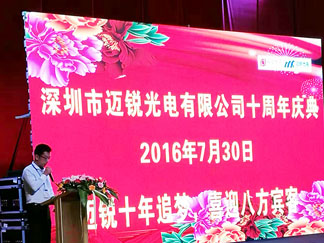 2016年7月30日,深圳市邁銳光電有限公司(以下簡稱邁銳光電)內(nèi)外鮮花燦漫、彩旗招展、氣球高懸,迎來了公司十周年華誕。為了感謝新老客戶的支持,在惠州皇冠假日酒店舉行了一場慶典活動,公司全體領(lǐng)導(dǎo)、客戶與合作伙伴齊聚一堂,共赴繁花似錦的十年之約。