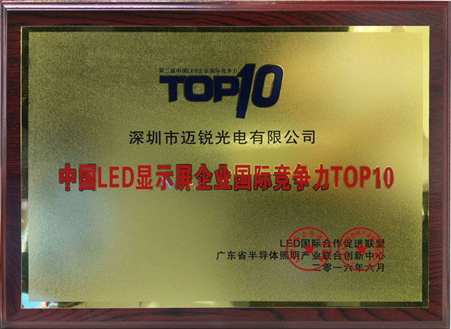 “中國LED顯示屏企業(yè)國際競爭力TOP10”頒獎盛會由200多家龍頭企業(yè)、上市公司等LED大型企業(yè)積極參與,邁銳光電憑借在LED顯示屏領(lǐng)域過硬的綜合實力,披荊斬棘,最終在200多家企業(yè)中脫穎而出,連續(xù)兩年蟬聯(lián),此獎的獲得是邁銳光電“LED顯示屏領(lǐng)導品牌”的有力佐證。
