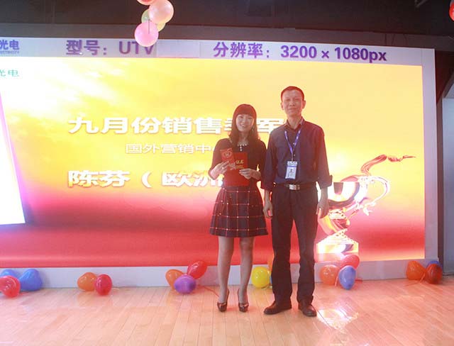 9月銷售季軍是來自歐洲區(qū)陳芬,她的直接領導人及歐洲區(qū)負責人joy上臺代領,現(xiàn)場中joy對陳芬進行了高度贊賞和認可:“她是一個務實,自信,努力的女孩,在我們組中是學習的榜樣”