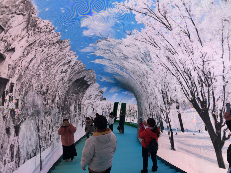 森林、冰雪、......不停變化的美景讓人迷醉,這一沉浸式時光隧道仿佛吞沒了一切,炫酷神秘的視覺效果吸引著眾多游客慕名而來,成功躋身洛陽又一網(wǎng)打卡地,成為倒盞村打造文旅融合的重要輸出窗口之一。